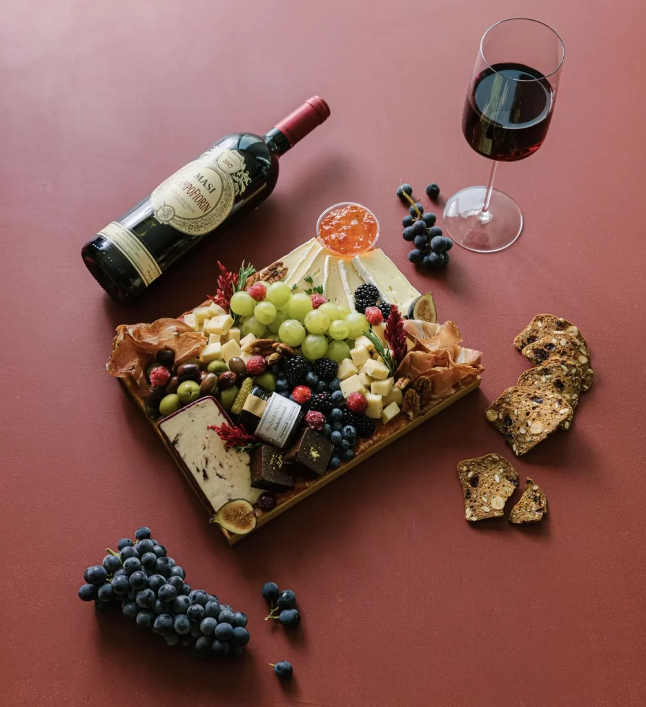 2 charcuteries (Speck and Genoa salami), 3 cheeses (Brie, Smoked Gouda, Bellavitano Merlot), crackers, signature preserve, truffle hummus, grainy mustard, asiago artichoke dip, 3 handcrafted macarons, chocolate wafers, 2 jumbo chocolate covered pretzels, nuts (walnuts & pistachios), olives & cornichons, fresh seasonal fruit, finished off with sugared cranberries, fresh rosemary and edible floral.