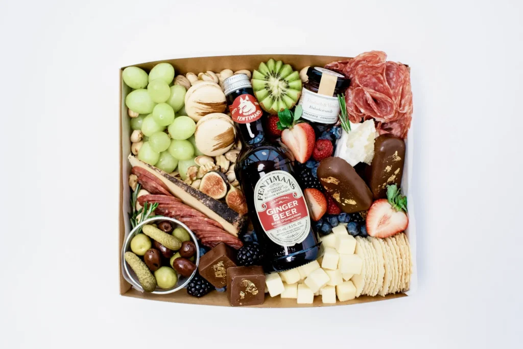 Triple Creme Brie, an assortment of cured meats, olives, cornichons, sugared cranberries, dried oranges, pistachios, edible floral and fresh rosemary. Each Graze Brie Tree comes complete with a box of 34 Degree crackers and a large jar of our signature preserve.