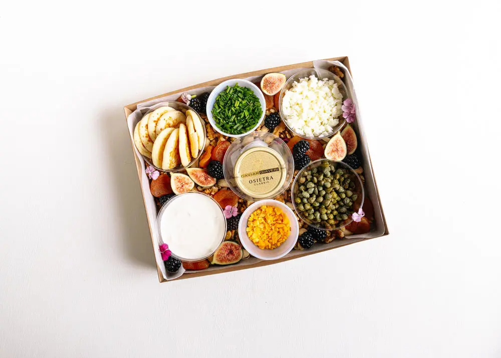 - 100g/125g tin of the Caviar of your choice (Northern Divine, Osetra, or Beluga) with every accompaniment you will need, which includes: Mini Blini, capers, crème fraîche, chives, egg white, and egg yolk.