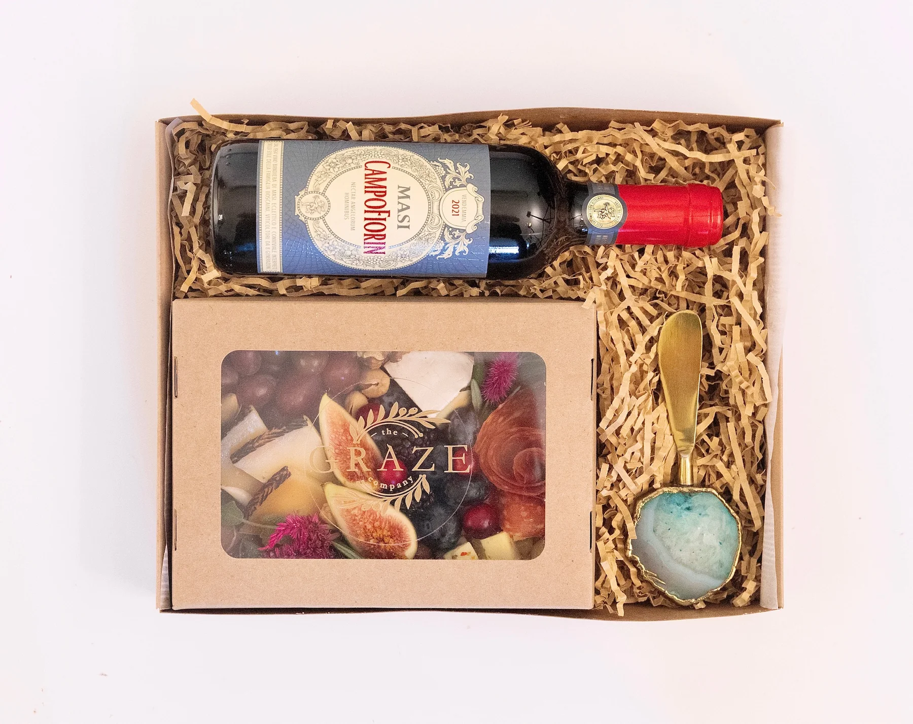 Accompaniments: An agate cheese knife and a mini bottle of your choice—Masi red wine, Moët Champagne or a non-alcoholic Rose Lemonade.